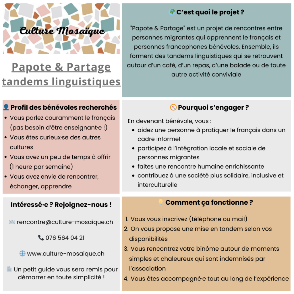 Papote & Partage est un projet de tandems linguistiques et culturels porté par notre association. Il met en lien une personne migrante qui apprend le français et une personne francophone bénévole, autour de moments simples et conviviaux : un café, un repas, une balade, un jeu, une discussion du quotidien.